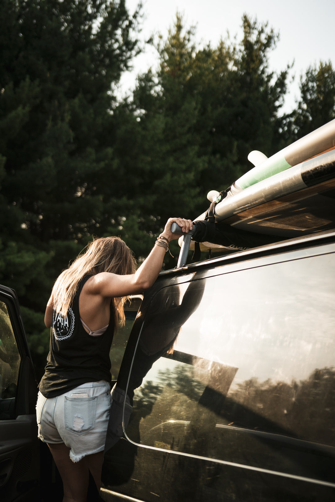 The key to this setup is having bars that are long enough to accommodate both the roof box and the boards, while still leaving space for handling and securing gear.